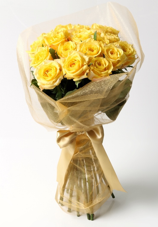 A delightful hand-tied bouquet of 20 yellow long stem luxury roses a double satin ribbon finishes off your luxurious gift.