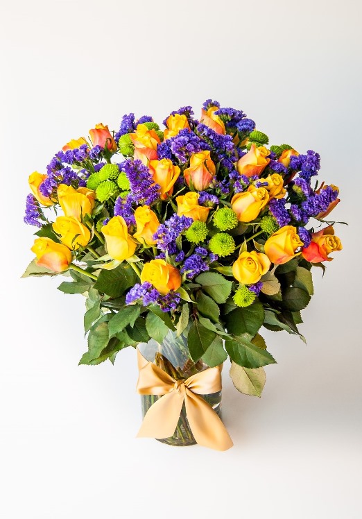 A gorgeous arrangement of 30 yellow luxury roses, green chrysanthemum spray and purple statice in a modern vase.